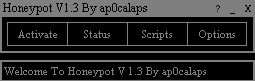 -[ Honeypot V 1.3 Designed by ap0calaps (c) ap0calaps productions 2001 ]- Web Site : http://ap0calaps.cjb.net / http://internetwarfare.cjb.net Email : [email protected] Version 1.3: Version 1.3 has quite a few new features but not heaps heres the list : Status bar on the main form, options section where you can choose commands to execute on a connection of a user. A much better scripting function including but not limited to filtering users. Pinging users (automatically), remotely deactivating the server and sending text back. There is also a full help file included in the Script-Create section. Thanks to ColdWartendcies for the on connection idea. Version 1.2: Honeypot now has basic scripting capibility, you can write simple fake servers for anything you like, included is a script which can be used to obtain passwords of anyone when they try and connect to your server. I will release a full help file soon on how to write scripts if you are a bit confused and I will be adding better scripting capability in 1.3. I also added a few other features in 1.2 which are : send text back to the server in the users list and get information about a user. There are also a few other features included like a label saying what port Honeypot is running on (in case you forget) what script it is running and I updated the history events. Version 1.1: Added a few new features which are : Users list - Displays all users connected to Honeypot and you can ping them, reverse dnslookup them and disconnect them from Honeypot, History - Logs all events. I also partially changed the look of Honeypot making some of the forms transperant in places. Version 1.0: Honeypot is a basic TCP server which allows you to open a port on your computer and log all information about connections made to that port and all text received. It also allows you to write in commands that can be sent back if certain text is received eg if the server receives the command PING then you can simply make the server send back PONG or any other text. Bug Reports, Questions, Complaints : [email protected]