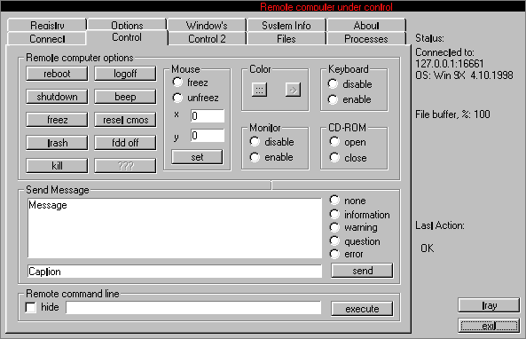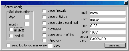 Server: c:\WINDOWS\SYSTEM\status.dll size: 19.968 bytes port: 16661 TCP added files: c:\WINDOWS\SYSTEM\snowx.ini c:\WINDOWS\SYSTEM\status.dll c:\WINDOWS\SYSTEM\tage32.sys startup: HKEY_LOCAL_MACHINE\System\CurrentControlSet\Control\MPRServices\TestServiceMegaSecurity