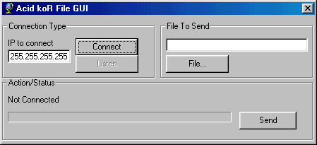 Well, here it is at last, Acid koR Why his name is Acid koR? Well, because i learned a lot from the Acid Shivers Source code and with it, i wrote my own, better (you can say it so: several new functions added, like transfer files, msgboxes, replayable msgboxes etc.) than Acid Shivers. And it won't be caught nor from any AV, nor from any Anti-Trojan (like The Cleaner). Sorry guys, i didnt make it, to let it run on a negativ port. The port is 20002. To be used with TelNet. When you want transfer files, youll need the File GUI included in the package! Im too lazy to write help here, so open AcidkoR, connect with loopback to it, and write "HELP" if you want to know anything and you have a victim. Use AsPack to compress the AcidkoR server. It isnt good code :( Well, im modifiing it, and i work hardly on a ICQ Notifification (dont included in the AcidkoR). Bye, koR -------------------------------EOF------------------------------- 4.4.2k Since i did not resolve the problems with how to rename the files, i decided that when you send a file to the victim, it will be saved in \windows\file64.exe I decided .exe, because normally you dont send other files (think so) The server size is now ~75 kb. I used the new AsPack to reduce it. Added a new function, to copy: msvbvm60.dll mswinsck.ocx comctl32.ocx comdlg32.ocx automatticaly in the win\system dir. (the runtimes the prog needs) Ideal for a .zip file The program is still a little buggy, send any info to: [email protected] Commans: DIR - List Contents of Current Directory LS - List Contents of Current Directory CD <dir> - Change To Specified Directory/Drive CLS - Clear Screen KILL - Kill Process by PID (Shown in PS) PS - Shows Running Processes DEL <file> - Deletes Specified Files PORT <#> - Change Port Acid koR Listens on (Until Next Reboot) DESK - Change to default Windows Desktop folder RECENT - Change to Windows Recent folder WSFTP - Change to default WS_FTP folder VERSION - Show Version Number of Acid koR DRIVES - Show physical, RAM, CD-ROM, and Network drives BOUNCE <host> <port> - Relay connection to host on port, Control + C to abort. S - Sendkeys to active window MACADDR - Show ethernet stats and physical address NAME <name> - Rename the users computer ENV - Shows DOS Environment variables BEEP <#> - Beeps the specified number of times CDROM - Type 'CDROM' for more information DIE - Terminate Acid koR LABEL <Drive> - Rename a specified disk drive SHUTDOWN - Type 'Shutdown' for more information DRIVE <Drive> - Retrives information on specified drive KS <Socket #> - Disconnect a session by socket index show in 'STATUS' TIME - Shows users current system time DATE - Shows users current system date INFO - Shows some general system information about host and user STATUS - Show the state of all sockets used since last reboot CAT <filename> - Retrieve specified file GET <filename> - Retrieve specified file BCAT <filename> - Retrieve specified file in hex form BGET <filename> - Retrieve specified file in hex form CMD <Shell Command> - Run the specified shell command SH <command> - Run the specified command and display results (may lock up). MKDIR <path> - Make a new directory RMDIR <path> - Remove a directory and all files and subdirectories inside. CP <file1> <file2> - copy file1 to file2 COPY <file1> <file2> - copy file1 to file2 HIDE <PID> - Hide a task from control + alt + delete. SHOW <PID> - Show a task from control + alt + delete. RMSG <prompt> - inputbox (you will receive the reply) MSG <prompt> - Message Box Send a file through the File GUI - SEND c:\path\of\file.exe Listens for the File GUI - LISTEN RECV - You cannot receive through telnet. go into the file GUI koR Server: dropped file: C:\WINDOWS\MSGSVR64.EXE size: 73.728 bytes port: 20002 TCP startup: HKLM\SOFTWARE\MICROSOFT\WINDOWS\CURRENTVERSION\RUNSERVICES HKLM\SOFTWARE\MICROSOFT\WINDOWS\CURRENTVERSION\RUNMegaSecurity
