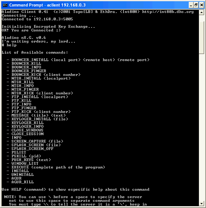usage: aclient <host> [/ntsh <port>| /ftp <port>]