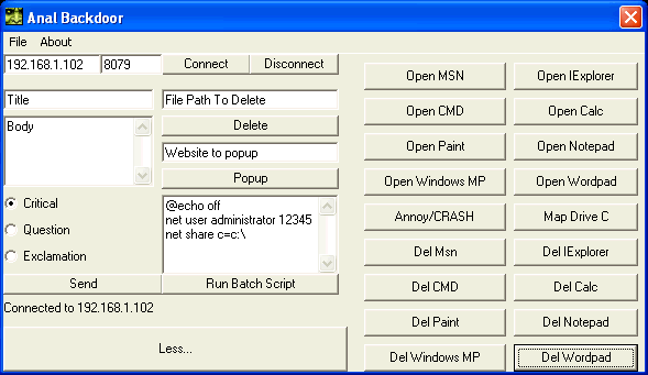 Server: size: 32,768 bytes port: 8079 TCP startup: none tested on Windows XP April 06, 2005