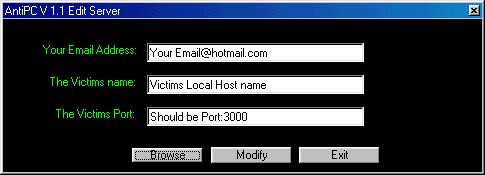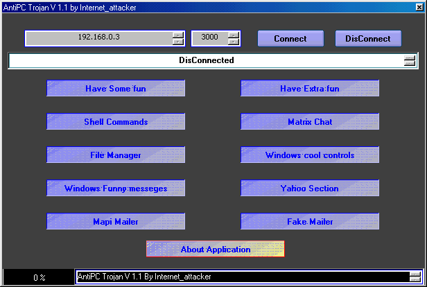 The information of the server: 1).The server make autorun himself in the windows 2).The server hide himself from Alt+Ctrl+Del list 3).The server will turnoff <Norton and Zonealarm> 4).All of the virus checkers cant find it. 5).The Server is fully work in :98/Me/2000/Xp 6).The server will mail you and say all of Victim's Computer Info. 7).The server is only 76Kb and 30 Kb in zip mode. 8).Server wont write any strings to registery so you the victim wont be able to find it in registery Internet_attacker Server: size: 114.688 bytes port: 30001 TCPMegaSecurity