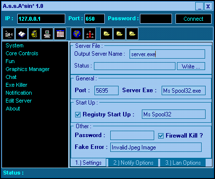 INFORMATION =========== ============================================= |Build / Version : 1.0 | |Author : ~LOM~ | |Co-Author : Anndy | | | |Beta Testers : Maison, Astreal, S13az3, xMs| |ShoutOuts : EES Team :D | ============================================= ============================================= |About Lom | |--------- | |Age : 17 | |Location : UK | |Current Occupation : A-Levels | |Favourite Saying : With Great Power Comes | | Great Responsibility | ============================================= Additional Information : ------------------------ Assasin was made in an attempt to give the users what they want. I know many of you found Lan victims a Pain in the 'ASS' as they clogged your ICQ pagers up, and there was nothing you could do about it! Now YOU can change that. Up and coming guides : ---------------------- Sleaze is releasing OL with his Injector technology (which bypasses software firewalls) it will have LAN Technology built into it as well, and have all the classic features of the current OL on release. It was thought by both I and Sleaze that a user could use these tools together and hack people that DON'T want to be hacked. NO ONE IS SAFE. NOT EVEN YOU! Written by ~LOM~ Server: size: 189.440 bytes port: 5697 TCPMegaSecurity