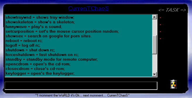 Server: c:\WINDOWS\Clean.exe size: 330.240 bytes port: 10359, 12471, 12504, 31163, 32076, 32365, 33812 TCP startup: HKEY_LOCAL_MACHINE\Software\Microsoft\Windows\CurrentVersion\Run "CleanRegV1.2" added: c:\WINDOWS\LICENSE.TXT c:\WINDOWS\Matrix.scrMegaSecurity