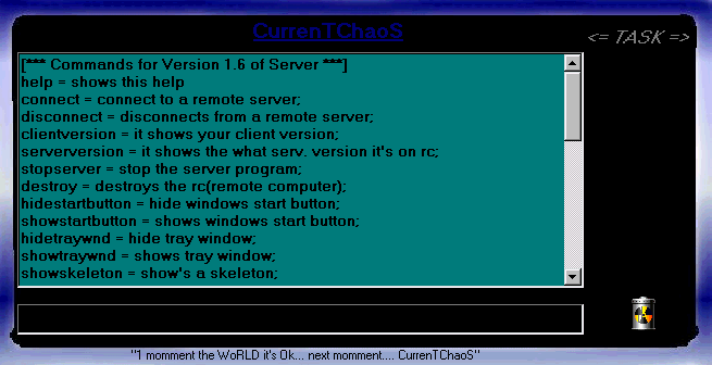 Server: c:\WINDOWS\Clean.exe size: 325.632 bytes port: 80, 21163, 22076, 22365, 23812, 41431, 43576 TCP startup: HKEY_LOCAL_MACHINE\Software\Microsoft\Windows\CurrentVersion\Run "CleanRegCV1.3" added: c:\WINDOWS\LICENSE.TXT c:\WINDOWS\Matrix.scrMegaSecurity