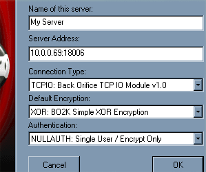 This pops up a dialog where you can define the parameters of the machine that you want to contact. You'll want to put in a name for this connection (doesn't matter what it is) in the 'Name of this server' field. Next, put in the server's IP address:port pair. We have to specify the port, since we reconfigured the server, and didn't change the defaults for the client. So we type in aaa.bbb.ccc.ddd:18006, replacing the letters with the real IP address of the server. Connection type should be TCPIO, encryption should be XOR, and authentication should be NULLAUTH. When you're done, hit 'OK'.