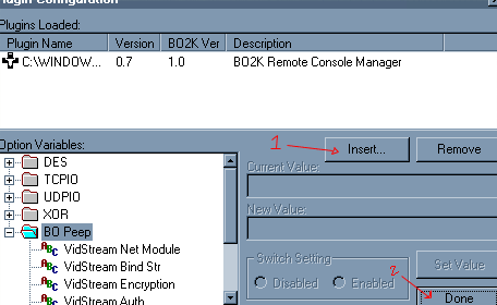 So, we hit the 'Insert...' button and choose the bo_peep.dll file. This adds the BO_PEEP plugin and puts the options in the tree control below. We didn't reconfigure BO_PEEP on the server side, so we won't have to configure it here. Just hit 'Done'.
