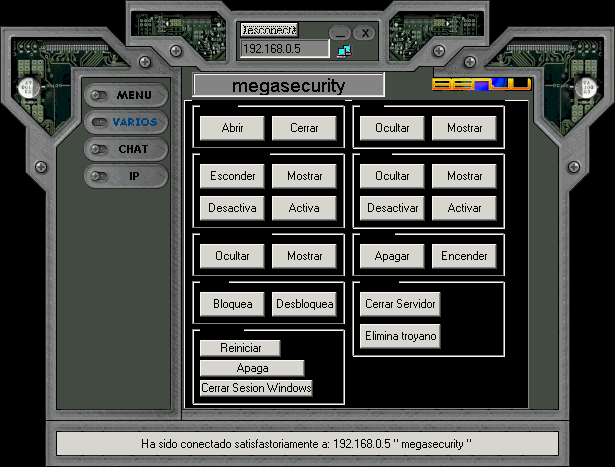 Server: dropped file: c:\WINNT\system32\Benju.exe size: 421,376 bytes port: 200, 15000 TCP startup: HKEY_LOCAL_MACHINE\SOFTWARE\Microsoft\Windows\CurrentVersion\Run "Benju" data: C:\WINNT\system32\Benju.exe tested on Windows 2000 May 28, 2005MegaSecurity