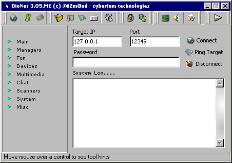 ### BIONET 3.XX.Xx #### OFFICIAL RELEASE : 14 Author : ®ëZmØnd Email : [email protected] Why bionet? BioNet has the most efficient server available today. With its own Unique file transfer protocol making transfers up to 90% faster. BioNet has its own unique encryption engine making it one of the safest in the world. We were the first to bring you functions such as ICQ notify , Flip VDU , AOL name stealer. We set the standards that our competitors struggle to keep up. With release 12 we are THE ONLY trojan currently to have a custom CGi notify. We are the only trojan to use an automated email to send you all offline keystrokes when the server comes online. No longer do you have to rely on ICQ to tell you when they are on and no longer do you have to wait for them to come online to download their logs. With broadband comming more widely available the new bionet 3 engine has the capacity to provide a stable platform for high speed data connections with multi threaded file transfer and realtime streaming media. This is where you will see many other existing trojans fail to cope under the strain. Latest UPDATES Current BioNet Version : 3.05.X BIONET ME New to release 14 ALL KNOWN BUGS FIXED. At last bionet is looking complete. After release 13 there was still alot that needed doing. BioNet client has new dialogs , and the existing functions have been improved such as a new "smart" resolution changer. The only thing to note is that the new change resolution is not compatible with old servers. We have a new IP scanner , a new Port scanner and tons of other things have been changed , the registry Editor is now complete it supports delete/create keys , strings and integers - Rezmond Server: port: 12349 TCPMegaSecurity