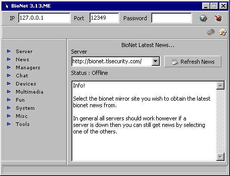 ### BIONET 3.XX.XX #### OFFICIAL RELEASE : 22 Author : ®ëZmØnd Email : [email protected] Why bionet? BioNet has the most efficient server available today. With its own Unique file transfer protocol making transfers up to 90% faster. BioNet has its own unique encryption engine making it one of the safest in the world. We were the first to bring you functions such as ICQ notify , Flip VDU , AOL name stealer. We set the standards that our competitors struggle to keep up. With release 12 we are THE ONLY trojan currently to have a custom CGi notify. We are the only trojan to use an automated email to send you all offline keystrokes when the server comes online. No longer do you have to rely on ICQ to tell you when they are on and no longer do you have to wait for them to come online to download their logs. With broadband coming more widely available the new bionet 3 engine has the capacity to provide a stable platform for high speed data connections with multi threaded file transfer and realtime streaming media. This is where you will see many other existing trojans fail to cope under the strain. Latest UPDATES Current BioNet Version : 3.13.X BIONET ME New to release 22 *Configurable shortcuts (client) *BioNix Intergration *Bug fixes File Downloaded From http://bionet.tlsecurity.comMegaSecurity