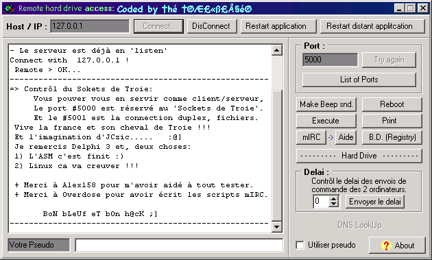 This trojan is the same as control-trojan but with a different password. Blazer5 is the client and port5000 is the trojan Password is: ClaudioClaudioCC Trailblazer Server: dropped file: C:\WINDOWS\SYSTEM\MSchv32.exe size: 335.872 bytes startup: HKCU\Software\Microsoft\Windows\CurrentVersion\RunMegaSecurity