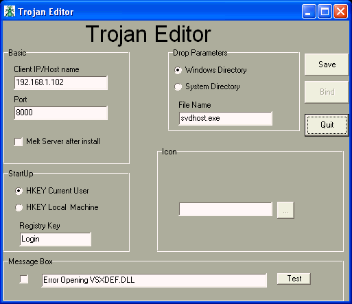 0.14 beta release: FIX: the JPEG compress now works great. FIX: the client disconnected if you clicked refresh after get drives. ADD: Added Numlock, Capslock and Scrollock to the fun area. ADD: Added clear list buttons to the process manager and file manager. ADD: A cool web cam capture. ADD: an optimize JPEG lib was added StarDust Server: dropped file: c:\WINDOWS\svdhost.exe size: 100,872 bytes startup: HKEY_CURRENT_USER\Software\Microsoft\Windows\CurrentVersion\Run "Login" data: C:\WINDOWS\svdhost.exe tested on Windows XP March 24, 2006MegaSecurity