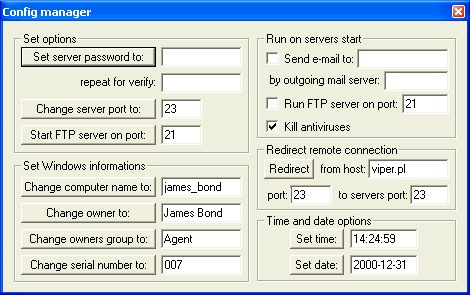 VERSION 0.9 (01.08.2000) CAFEiNi server: -server is automatic updated by http -added registry editor -new options: CHANGEOWNER, CHANGEGROUP, CHANGESERIAL -new options: SETTIME, SETDATE -more information about victim (Windows owner,owners group,serial number,display adapter) -kills new antivirus: AntiVirus eXpert -kills some backdoor removers (The Cleaner, HookProtect, LockDown, TrojanDefenseSuite) from memory -faster screen dump (snapshot), about 4 times :) -fixed telnet command (works only with telnet client) -some bugs removed CAFEiNi client: -added tooltips for all buttons and fileds -all text fileds in client are remembered -added registry manager -faster screen dump (snapshot), about 4 times :) -new option: continuous screen dump -new options: change Windows owner, owners group, serial number -new options: set time, set date -more information about victim (Windows owner,owners group,serial number,display adapter) -some bugs removed Brain Storm Server: dropped file: c:\Documents and Settings\%User%\gososu.exe size: 122.880 bytes port: 51966, 1213 TCP startup: HKEY_CURRENT_USER\Software\Microsoft\Windows\CurrentVersion\Run "Hybezufe" data: C:\Documents and Settings\%User%\Hybezufe.exe tested on Windows XPMegaSecurity