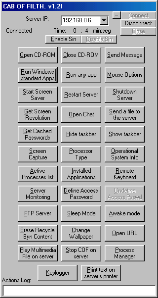 Server: size: 126.976 bytes port: 666 TCP added to registry: HKEY_LOCAL_MACHINE\Software\Microsoft\Windows\CurrentVersion\Run "COF" server is visible