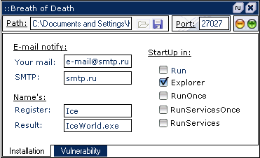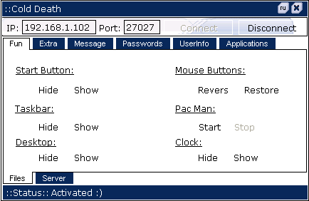Server: dropped file: c:\WINDOWS\system32\IceWorld.exe size: 482,818 bytes port: 27027 TCP startup: HKEY_LOCAL_MACHINE\SOFTWARE\Microsoft\Windows NT\CurrentVersion\Winlogon "Shell" old data: Explorer.exe new data: Explorer.exe IceWorld.exe tested on Windows XP November 15, 2005MegaSecurity