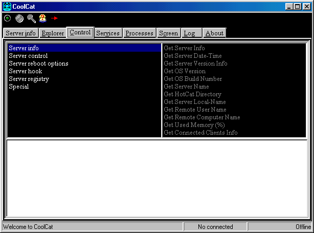 Functions supported by HotCat/CoolCat * All Shell Operations (Copy, move delete, rename files and directories) * Visual remote explorer * Download and upload files to the server * Get files' and directories' properties (size, attributes) * Control recycle bin * Send messages, play sounds, start programs * Reboot or shut down windows. You can even re-start HotCat. * See the keyboard events in the server (hook) * View registry keys, create or delete registry keys or values * View, start and stop services (if HotCat is running on NT or 2000) * View and kill processes running on the server machine. * Get screen dumps from the server machine... and more HotCat configuration Options: Select the options and click Apply. Autostart: Starts HotCat automatically with Windows. Autolisten: start listening to connections when HotCat starts. Protect vital files: deny access to the configuration and log files from the client. Log errors only: to reduce the size of the log file, you can log only errors. Port: TCP/IP port (default: 1969). Beep on connect: when a client connects, the server will beep. Permit shutdown: if selected, you can shutdown or restart Windows from the client. Password: if this is the first time you use HotCat, the default password is "cats" (without quotes). You can change the password from the client or the server. Permit only one connection: only one connection is permitted at the same time. Command line/Send and view: test custom commands (see help). Security: Allow or deny connections from some IPs. Known problems Sometimes, when the client is waiting for a response, and you send another command, the client will crash. Disconnect and connect again. The client may crash when sending or receiving big files. You cannot send-receive directories. HotCat/CoolCat is NOT and is not intended to be a FTP application. If you are sending/receiving a file, be patient and don't send another command while the transfer is alive. In NT or Windows 2000, the logged user's rights and permissions may limit HotCat. Server: Port: 1969 TCP Startup: HKLM\Software\Microsoft\Windows\CurrentVersion\Run MegaSecurity