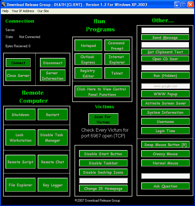 Features in Version 1.2: 1. New Port Used (6967, 6968 TCP For Server), (4998 , 4999 TCP For Client) 2. Remote Script (Create and run batch files) 3. Remote Chat (Chat with your victum and change his name) 4. Disable/Enable start button, taskbar, desktop icons 5. Change Internet Explorer Homepage 6. Run programs hidden now with run command 7. Screenshot taker is improved, it gets active window instead of whole desktop so download is faster 8. Improved Taskmanager blocker 9. Bug Fixes are below: * Connection Bug, used to keep saying connecting, when it wasn't connected - FIXED * Downloading 0kb files crashed client and caused errors for server - FIXED * Getting properties sometimes crashed the client and discrupted the server - FIXED No Server available Tested on Windows XP May 12, 2008MegaSecurity