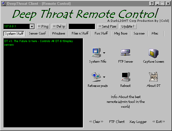 DarkLIGHT Corp Production by ^Cold^ By using this software you agree that I am NOT liable for any consequential, special, incidental or indirect damages of any kind arising out of the delivery, performance or use of this software. All of the features are quite stright foward i don't have time to explain them in full right now but in the next release i will. Known Problems - The FTP client is a bit unstable i am still working on it It's best to use a well know FTP Client like bullet proof also the sendkeys function is acting up as well some times it works some times it doesn't when it doesn't it just sends the keys to the top window. the '|' charecter can be used as a return or enter Also when scanning the buttons get stuck up but they still work this is a problem with the button component i used Cool features - Net Get - This rules!!! gets the server to d/l a file from a web site Port Redirect - Sp00f your ip with this (basically it acts like a proxy) Key logger - Watch what they type in real time Any way have phun ^Cold^ Server: size: 266.752 bytesMegaSecurity