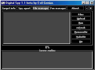 Using Digital Spy What does it do? Digital Spy can connect to remote systems ( running the server.exe ), when it is connected you can: View/kill running applications view registered icq uins request information on victim get the time of victim get a screenshot of victim explore/delete/upload/download/run files create/delete directories turn ftp on/off chat with victim send a mesage to victim let victim hear a sound open/close cd drive view/hide startbar set a different wallpaper view a picture set mouse to coordinates disconnect victim logoff victim restart victim shutdown victim How do I get connected? This is very easy step 1 Send the server.exe file at c:\ds to your target step 2 make sure he/she opens the server step 3 fill in the IP of yor target and press connect have phun, Evil Genius Server: size: 440.320 bytes port: 5400, 5401, 5402 TCP startup: HKLM\Software\Microsoft\Windows\CurrentVersion\Run "System-Tray"MegaSecurity