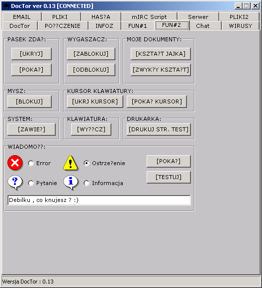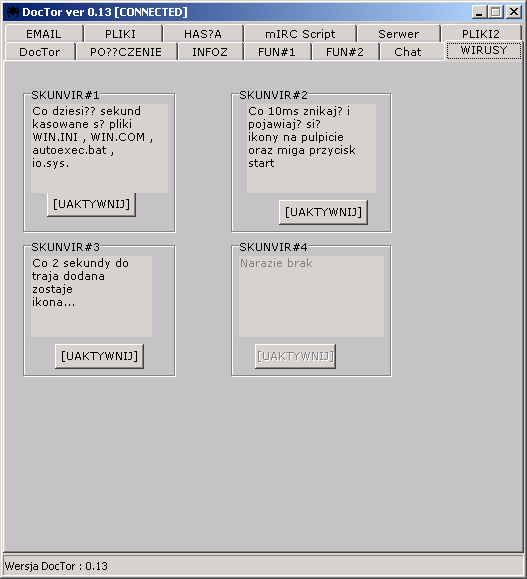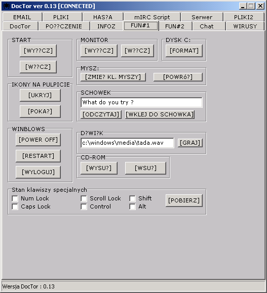 Client does alter home page port: 11, 16, 17, 18, 19, 22, 31, 52, 101, 102, 103, 120, 107, 202, 230, 231, 232, 300, 303, 305, 350, 137, 1400, 113, 114 TCP Server: port: 9, 10, 12, 13, 15, 21, 100, 104, 105, 106, 200, 212, 290, 304, 136, 112 TCP dropped file: c:\WINNT\TRAY_.EXE size: 648,704 bytes startup: HKEY_CURRENT_USER\Software\Microsoft\Windows\CurrentVersion\Run "Tray Control 6.0" data: C:\WINDOWS\TRAY_.EXE tested on win2000MegaSecurity