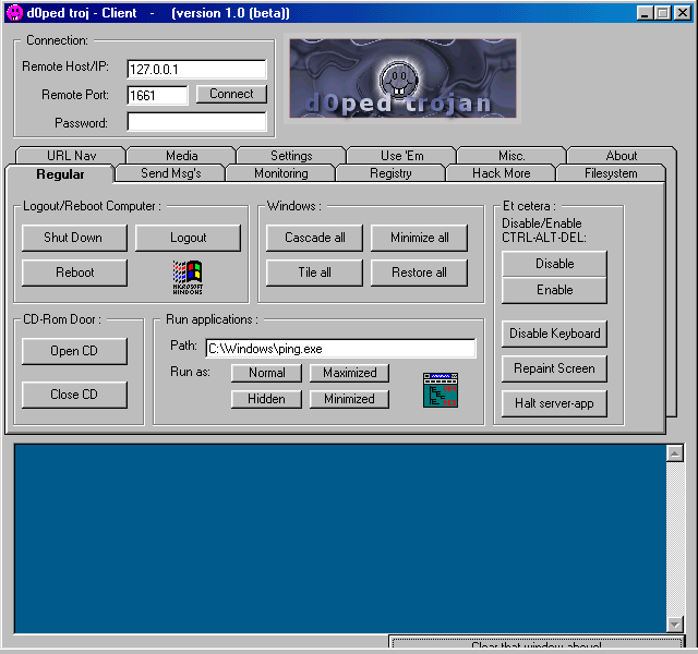 d0ped Trojan is a client/server thing, running under any Windows9x or XP. The zip-file containing this textfile, also includes a setup file. Install the packets, then walk through the Start/Program menu. You'll find a new menue called "Telhack Inc", whereunder you'll find the Client app. The server application is simply named "d0ped.exe" as default. As far as i know, CTRL-ALT-DEL (which - ofcourse - your'e able to disable:) list will display the EXE-name of the file as a running process. You might see this "trojan" as a later version of the "Rths"-trojan? Well HECK it's not! This one is not to be controlled by any terminal session, it has its own client application. The d0ped Trojan also contain a lots of (new) amusing functions, for example: * Snoop on users Internet Explorer navigation * Edit filesystem * Process and hardware status * Constant change-of-system-wide-parameters status * Hide mousecursor * Very nice black textscreen function * A silly "Please Enter passwords:" function * Automatic search for Internet login/password * Desktop management * "Use 'Em": use the server to initiate a third session. (Use the target as a secound terminal). * Or initiate a hidden pingflood against.. anything. * Desktop Management * Port- and Password Settings * A cute "incomming data"-textbox - Default port is: 1661 - There is no password set as default. Zeromatic Server: size: 184.320 bytes port: 1661 TCP startup: HKEY_LOCAL_MACHINE\Software\Microsoft\Windows\CurrentVersion\Run "Rundll32"MegaSecurity