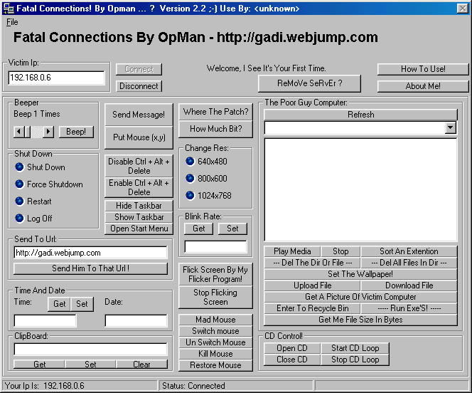 Server: dropped file: c:\WINDOWS\SYSTEM\PATCH.exe size: 118.784 bytes port: 455 TCP startup: HKEY_LOCAL_MACHINE\Software\Microsoft\Windows\CurrentVersion\Run "WinTray" data: c:\windows\system\PATCH.exe tested on Windows 98 January 02, 2004MegaSecurity