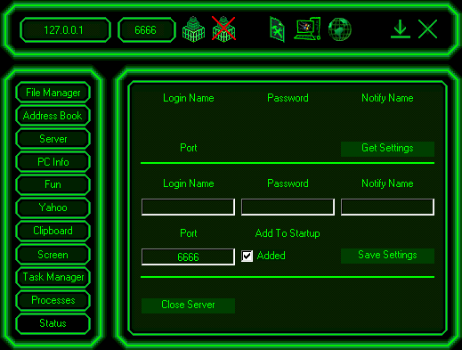 Server: size: 53.248 bytes port: 1700, 1800, 3000, 3100, 6666 TCP startup: none