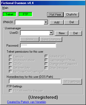Telnet and FTP server Login with a standard telnet client (available on all platforms) Reboot or shutdown the system remotely Control the Daemon itself also remotely (incl. setting up FTP accounts and rights) Transfer files with standard FTP clients (available on all platforms) Anonymous FTP user support Op to 99 simultanious connections (configurable limit) Create/Simulate Virtual filesystems with Unix-like paths Remotely control and schedule commands daily, weekly or monthly Startup batchjobs or other programs remotely (with limited remote control) Consumes little memory and processor usage Install as service both on NT/2k/xp and Windows 95/98/Me with 2 clicks Patrick van Venetiën Server: size: 424.448 bytes port: 20, 21, 23 TCP remark: server can run visible and invisibleMegaSecurity