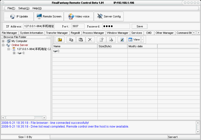 Server Dropped File: c:\WINDOWS\F_Server.exe Size: 708,096 bytes Added to Registry: HKEY_LOCAL_MACHINE\SYSTEM\ControlSet001\Services\FinalFantasy_Service "ImagePath" Data: C:\WINDOWS\F_Server.exe HKEY_LOCAL_MACHINE\SYSTEM\CurrentControlSet\Services\FinalFantasy_Service "ImagePath" Data: C:\WINDOWS\F_Server.exe Tested on Windows XP May 21, 2008MegaSecurity