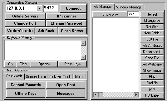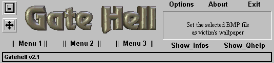 Well, this new version of gatehell is NOT compatible with the oldest versions (1.8), Alot of bugs was corrected (thanks for bug reports) and more options implemented. The interface is almost the same and the default options too (default port.. etc). For likes the outhers known program for RA (Remote Administration), the gatehell is divided in 2 parts : THE CLIENT PART - Use this for operate the server in a remote computer, givin' you more control than the self person in the another side... THE SERVER PART- after installed will open their ports , and wait for connections. The server support MULTI CONNECTIONS now! If you wanna connect for yourself (for test) , run the server (Server.exe - default name) and type: 127.0.0.1 (IP) or Localhost (Host) into IP box in the client, and press connect. The Server is invisible to the Task List (CTRL+ALT+DEL) When the server is executed, he self-installs, and will be initialized every time windows start (you are able to customthe method by editting the server before sendin' to remote PC). DevilBinho Server: c:\WINDOWS\SYSTEM\WinUnistall.exe size: 421.214 bytes port: 5295, 5296, 5297, 5298, 5299, 5300, 5301, 5432 TCP startup: HKEY_LOCAL_MACHINE\Software\Microsoft\Windows\CurrentVersion\RunServices "WinSys" added: :\WINDOWS\pcinfo.txt c:\WINDOWS\SYSTEM\libbz2.dll c:\WINDOWS\systemIO.dllMegaSecurity