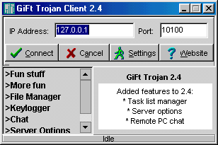 Server: dropped file: c:\WINDOWS\SYSTEM\giftvictim.exe size: 460.802 bytes port: 10100 TCP startup: HKEY_LOCAL_MACHINE\Software\Microsoft\Windows\CurrentVersion\Run "GiFtVictim" data: C:\WINDOWS\SYSTEM\giftvictim.exeMegaSecurity