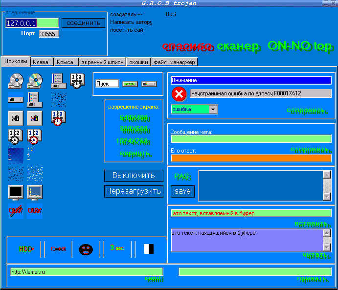 Server: dropped file: C:\WINDOWS\mmflash.exe size: 250.403 bytes port: 22222, 33555, 57785 TCP startup: HKCU\Software\Microsoft\Windows\CurrentVersion\RunOnce "Mmedia Suport" HKLM\Software\Microsoft\Windows\CurrentVersion\Run "Mmedia Suport" Added: c:\WINDOWS\sys.cfMegaSecurity
