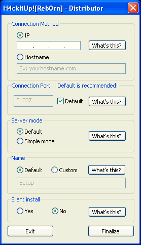 Releaseinfo for v1.0 Added: - Function for changing the Ip-address or Hostname the Host connects to. - Hostviewer: View the connected hosts and select one to connect to! - Startup box. Here you can change how many connections you can have && which port is used! Changes: - Removed the ordinary connection method. Lets multiple hosts connect to you. - Faster ServerRestart. - Some smaller esthetic changes. Fixes: - Like nothing. One textrelated thing. Comments: - "Final release! :(:. Have to do other things now..." - "v1.0 and up is NOT compatible with versions below v1.0!!" - "This shit is more complicated than people think!" - "Had to change a large portion of the skeleton. But I managed it! :)" Server Dropped Files: c:\WINDOWS\system32\perfosd.dll Size: 280 bytes c:\WINDOWS\system32\Com\svchost.exe Size: 74,752 bytes Added to Registry: HKEY_LOCAL_MACHINE\SOFTWARE\Microsoft\Windows\CurrentVersion\Run "svchost" Data: C:\WINDOWS\system32\com\svchost.exe Tested on Windows May 20, 2008MegaSecurity
