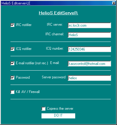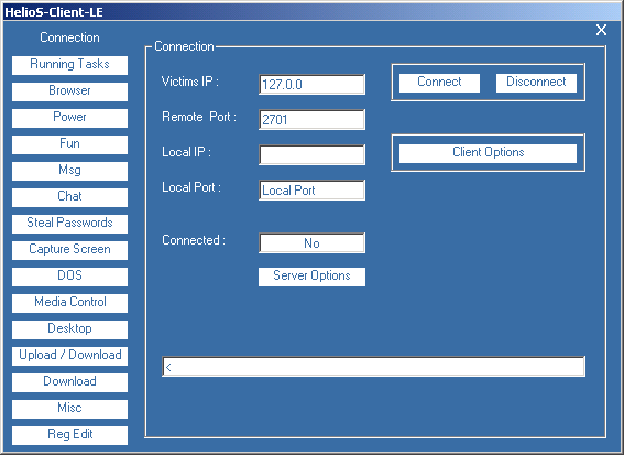 full VB6 trojan horse startup ------- reg/run reg/runservices win.ini system.ini (still to come) functions --------- -running tasks -running windows -upload -download -full media control -all the lamer stuff and lots more -capture screen bmp or jpeg -desktop clicker -change every color you want -msg box -input box -chat -full DOS control -netstat control -seceret kernel commands -change the start button -regeditor -file browser and all the file functions (del, copy, ...) -windows boot options (power off, reset, log off, ...) -the matrix -earthquake -pacman joke -change wallpaper -play a movie, mp3, wav, Audio CD, ... -full winamp and mediaplayer control -let his pc talk (merlin) -i am gay joke -steal his passwords -change his resolution -let him download a file from the internet -change his internet explorer settingsMegaSecurity