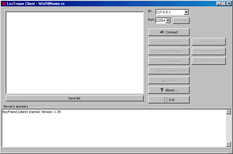Ver: 0.9 * A complete rewrite of the Girfriend C/S Suite from General Fault * Added Mutex verification * Added Filesize Info to FileManager * Fixed Severe bugs in File Transmission * Fixed Bugs in Download client ( filename truncated) * Added exception handling in Server * Added Support for Removable & Network Drives * Added Widowlist manipulation (Bring to front, close..) Known Bugs: * Client mangles the 'last ip list' on connection error - must delete hosts.ip * Server may not respond after some erroneous connection * Communication is not blocked while Sending & receiving file Server: C:\WINDOWS\WINDLL.EXE size: 209.920 bytes port: 22554 TCP startup: HKLM\SOFTWARE\Microsoft\Windows\CurrentVersion\Run