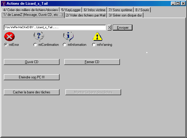 Server1 (serveur_sans_le_jeu.exe, 184 KB): c:\WINDOWS\HELP\hlp.exe size: 187.904 bytes port: 23, 81, 714, 8181, 23762 TCP startup: HKEY_LOCAL_MACHINE\Software\Microsoft\Windows\CurrentVersion\Run "hlp.exe" added: c:\WINDOWS\SYSTEM\dxdlg.exe Server2 (serveur_avec_jeu_mamba.exe, 271 KB): c:\WINDOWS\HELP\hlp.exe size: 187.904 bytes port: 23, 81, 714, 8181, 23762 TCP startup: HKEY_LOCAL_MACHINE\Software\Microsoft\Windows\CurrentVersion\Run "hlp.exe" added: c:\WINDOWS\TEMP#01.EXE c:\WINDOWS\TEMP$01.EXEMegaSecurity
