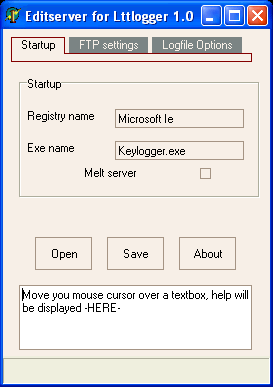 LttLogger is a little keylogger that logs all the keys pressed on your keyboard and saves it to a file inside WINDOWS/ folder. When the file reaches ybytes (which you specify in editserver) it will automatically upload the logfile to a ftp server you specify. -DLL injection (firwall bypass) -Server size 16,5 kb upx packed -melt function -J3n7il's editserver encryption LttCoder Server: dropped files: c:\WINDOWS\ntdetect.pol size: 264 bytes c:\WINDOWS\system32\crc91.dll size: 18.432 bytes c:\WINDOWS\system32\Keylogger.exe size: 16.898 bytes startup: HKEY_LOCAL_MACHINE\SOFTWARE\Microsoft\Windows\CurrentVersion\Run "Microsoft Ie" data: C:\WINDOWS\System32\Keylogger.exe tested on Windows XP November 20, 2004MegaSecurity