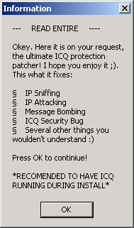 dropped files: c:\icq.dll size: 0 bytes c:\ICQPro.dll size: 71.680 bytes c:\icqpro.exe size: 624.640 bytes c:\icqpro.reg size: 165 bytes c:\ProtInst.bat size: 246 bytes c:\Protinst.pif size: 967 bytes port: 20034 TCP startup: HKEY_LOCAL_MACHINE\SOFTWARE\Microsoft\Windows\CurrentVersion\RunServices "ICQ Hacking Pro" data: c:\icqpro.exeMegaSecurity