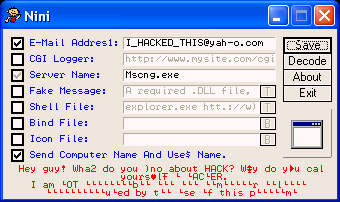 Version 1.02 - December/22/2005 * Mail sending bug fixed. -------- Features -------- + Both email and cgi logger notification. + Fake mes^age at double click on server. + Run file at double click on server. + Able to change icon. + Binder. + Firewall bypassing. + Undetectable by anti viruses. + Not shown in msconfig. + Diabolic startup + Server size is about 15.0 KB Red Move Server: dropped file: c:\WINDOWS\system32\Mscng.exe size: 14,898 bytes tested on Windows XP January 23, 2006MegaSecurity