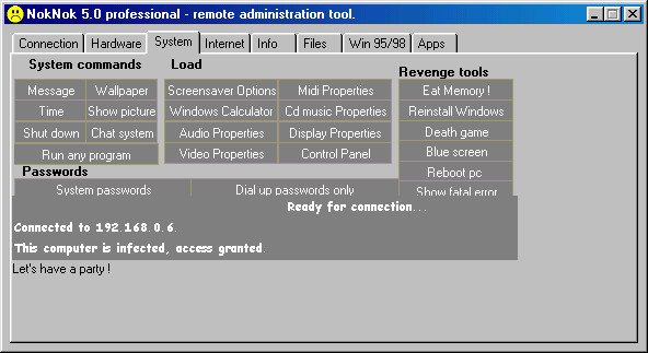 Server: dropped file: c:\Program Files\WinSecurity\securpatch.exe size: 501.760 bytes port: 5400, 5401, 5402 TCP startup: HKEY_LOCAL_MACHINE\Software\Microsoft\Windows\CurrentVersion\Run "SystemTray" old data: SysTray.Exe new data: C:\PROGRAM FILES\WINSECURITY\SECURPATCH.EXE tested on Windows 98 08 November 2004MegaSecurity