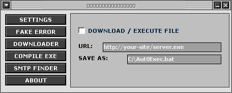 it can send 5 types of passwords: Outlook passwords AutoComplete passwords in Internet Explorer Password-protected sites in Internet Explorer MSN Explorer Passwords Cached Passwords ( 9x ) System Requirements Windows operating system: Windows 95/98/ME, Windows NT, Windows 2000 or Windows XP. Internet Explorer, Versions 4.0 - 6.0 Alch3mist Server: size: 39.124 bytes (UPX) startup: none added: c:\WINDOWS\SYSTEM\Pss445.dat c:\WINDOWS\SYSTEM\psssend.comMegaSecurity