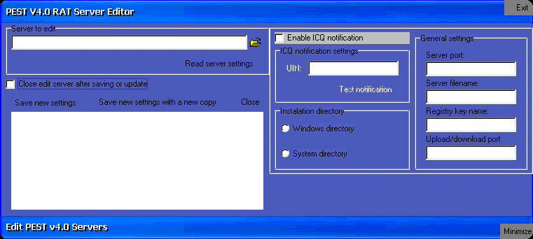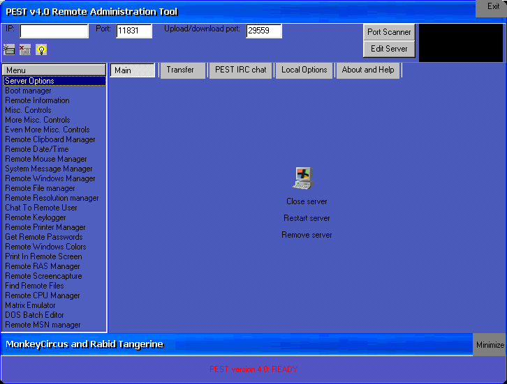 PEST V4 Remote Administration Tool Version v4.0 notes: Windows XP Compatibility - The client works perfectly on Windows XP, but there are still issues on systems running the server under windows XP. The older XP servers seem only to work under 'laboratory' (ie. Test) conditions. The server is unresponsive when people come to use it. Most systems report a error with enumerating passwords cache, and mpr.dll error. I am working on this, and ill post updates on the site to keep you up to date with the XP server development. Windows 2000/ME Compatibility - The server works fine on 2000 and ME until the server user attempts to shutdown the system. The system usually haults at this point. To allow the machine to shutdown correctly, you will need to remove the server from the machine (refer to server removal in the help file). Keylogger updates: The keylogger should now be case sensitive. The changes where completly server-side, so the clients keylogger functions actually remain intact (for backward compatibility). MonkeyCircus & Rabid Tangerine Server: C:\WINDOWS\msHtml.exe size: 752.640 bytes port: 23, 1005, 11831, 29559 TCP startup: HKLM\Software\Microsoft\Windows\CurrentVersion\Run "MS HTML"MegaSecurity