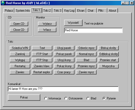 Server: size: 519.680 bytes port: 12, 1212, 1234, 1986, 2211, 4321 TCP startup: HKEY_CURRENT_USER\Software\Microsoft\Windows\CurrentVersion\Run "msgrov.dll.exe"