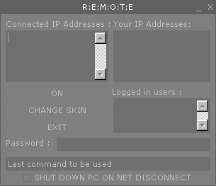 You know the drill, your PC is downloading and will be done in 10 mins. BuT you have to be at work/school now! what are you gonna do, leave your PC on ALL DAY? Well, you don't need to now. you can just start this program, switch the server and now you can control your PC remotely. nice. But, there are other programs like this, and i don't have time to put the client.exe on to a disk, i have to go NOW! What? there are no other programs like this! You don't NEED a client.exe all you need is access to a web browser. Type http://(your IP)/ into the browser and away you go. Features: +- Password Protection +- Shut down PC +- Check all running windows +- Check the IP's of all people who have connected +- View all the links in your favorites folder +- Create different 'skins' for the application and the web page you see. HaTcHeT Server: size: 240.640 bytes port: 80 TCP startup: none