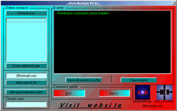 Server: size: 200.704 bytes startup: HKEY_LOCAL_MACHINE\Software\Microsoft\Windows\CurrentVersion\Run "bootlogfile" HKEY_LOCAL_MACHINE\Software\Microsoft\Windows\CurrentVersion\Run "msmsg" HKEY_LOCAL_MACHINE\Software\Microsoft\Windows\CurrentVersion\Run "msmsgr" HKEY_LOCAL_MACHINE\Software\Microsoft\Windows\CurrentVersion\Run "Norton antivirus scan" HKEY_LOCAL_MACHINE\Software\Microsoft\Windows\CurrentVersion\Run "office decryptfiles" HKEY_LOCAL_MACHINE\Software\Microsoft\Windows\CurrentVersion\Run "start bat file" dropped files: c:\io.dll Size: 26 bytes c:\WINDOWS\sprocks.bmp Size: 26 bytes c:\WINDOWS\SYSTEM\diskf.dll Size: 26 bytes c:\WINDOWS\SYSTEM\reginf.ret Size: 26 bytes