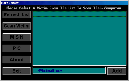 -=-=-=-=-=-=--=-=-=-=-=-=-=-=-=-=-=-=-=-=-=-=-ROSY BARTOSy=-=-=-=-=-=-=-=-=-=-=-=-=-=-=-=-=-=-=-=-=-=-=-=-=-=-=-=-=-=-=-=-= Thankyou for choosing the RosY Bartosy msn trojan. First I will guide you through the steps of how to infect someone and have some fun! Ok first I will explain what the files do that came in the zip file. renameme.exe and renameme.jpg is the file you send to someone. Once they have recieved the file and run it. The file will login to an ftp and download all the files needed to run the trojan without them even knowing it. The file u send them is only 20kb. Then use the following commands. I suggest after you send them the file type find_server. This will verify that the server and its files have downloaded correctly. The good thing is that the victim does not see the commands inside there window just like a winsock trojan. That is basically it. Below are the commands. note: this is version 1.0 which means it can be buggy and limited in features. Just wait until next version! Or you can use the included client that Heathy made! --===TROJAN===-- RB_scan = Scans the contact to see if they are infected with the trojan RB_startenable = Adds the trojan to windows startup if you or they have removed it RB_startdisable = Removes the server file from windows startup RB_update = This will update the server to the latest version through ftp RB_lastscan = This will tell you the last person to scan the server --===COMPUTER STUFF===-- RB_shutdown = This will shutdown the victims computer RB_logoff = This will logoff the user from windows RB_restart = This will restart the victims computer RB_getip = Get the victims local IP address RB_getport = Get the victims default port info RB_compname = Get the name of the victims computer RB_stealdrives = Get detailed information on the drives on the victims computer RB_cdopen = Open the victims cd drive RB_cdclose = closes the victims cd drive RB_cdopen5 = Open and close the victims cd drive 5 times RB_res640X480 = Change the victims screen reolution to 640X480X32 RB_res800X600 = Change the victims screen reolution to 800X600X32 RB_res1024X768 = Change the victims screen reolution to 1024X768X32 --===MSN STUFF===-- RB_security = Changes victims security message to Rosie Bartosy has got ya! RB_textlimit3 = Changes victims text limit to 3 RB_textlimit50 = Changes victims text limit to 50 RB_textlimit400 = Changes victims text limit to 400 RB_textlimit1200 = Changes victims text limit to 1200 --===STATUS===-- RB_online = Sets the victims Msn status to Online RB_busy = Sets the victims Msn status to Busy RB_brb = Sets the victims Msn status to Be Right Back RB_away = Sets the victims Msn status to Away RB_onthephone = Sets the victims Msn status to On The Phone RB_outtolunch = Sets the victims Msn status to Out To Lunch RB_appearoffline = Sets the victims Msn status to Offline Heathy & Luke Server: size: 20 KB startup: none