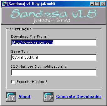 Sandesa is a small web downloader that downloads any file from web and executes it. This version is just 1.59 kb (packed) in size. Features ICQ notification as well. Hint: Since these days its getting more and more difficult to find webservers who allow hosting exe files, so heres a trick. Just change the extension of your exe file to something else like for example .jpg and upload it to your fav. webhost. In sandesa give the URL to this renamed jpg file, and in the 'Save To' textbox specify the filename with exe extension. Sandesa will download the file and execute it as exe :)~. Special thanks to X-HUMANATION, azote & Lucifer0000 for their continued support and testing. Gobo (Free Gobo! - http://www.freegobo.com) 20/6/2003 jaNooNi Server: size: 1.632 bytesMegaSecurity