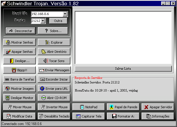 Server: dropped file: C:\WINDOWS\User.exe size: 200.704 bytes port: 21212 TCP startup: HKEY_LOCAL_MACHINE\Software\Microsoft\Windows\CurrentVersion\Run "User.exe" data: C:\WINDOWS\User.exe tested on Windows 98 April 01, 2005MegaSecurity